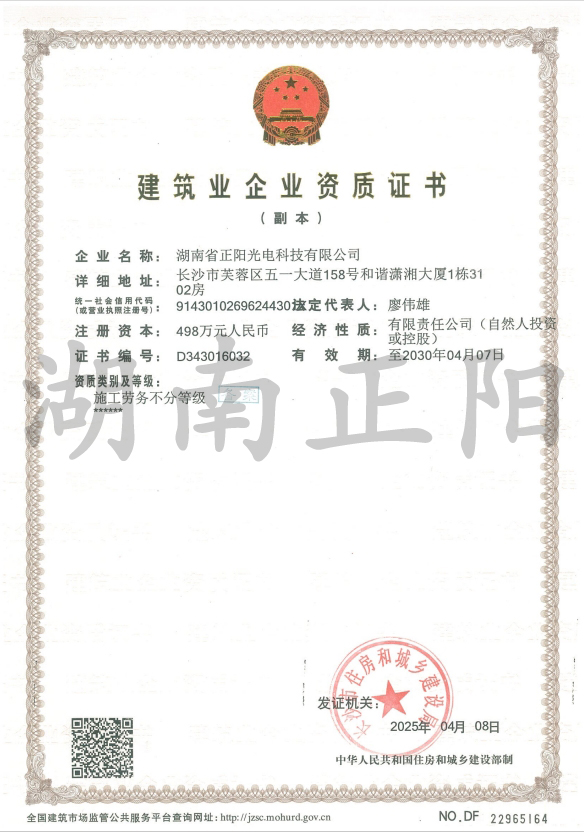 湖南省正陽(yáng)光電科技有限公司是一家從事亮化工程及大型燈光藝術(shù)的設(shè)計(jì)、制作、安裝和維護(hù)于一體的專(zhuān)業(yè)化公司。公司資質(zhì)齊全、管理嚴(yán)謹(jǐn)、技術(shù)先進(jìn)、實(shí)力雄厚,取得了城市及道路照明工程專(zhuān)業(yè)承包壹級(jí)資質(zhì)、照明工程設(shè)計(jì)專(zhuān)項(xiàng)甲級(jí)資質(zhì)、機(jī)電工程施工總承包貳級(jí)資質(zhì)、施工勞務(wù)等資質(zhì),榮獲“重質(zhì)量·守誠(chéng)信”示范企業(yè)。